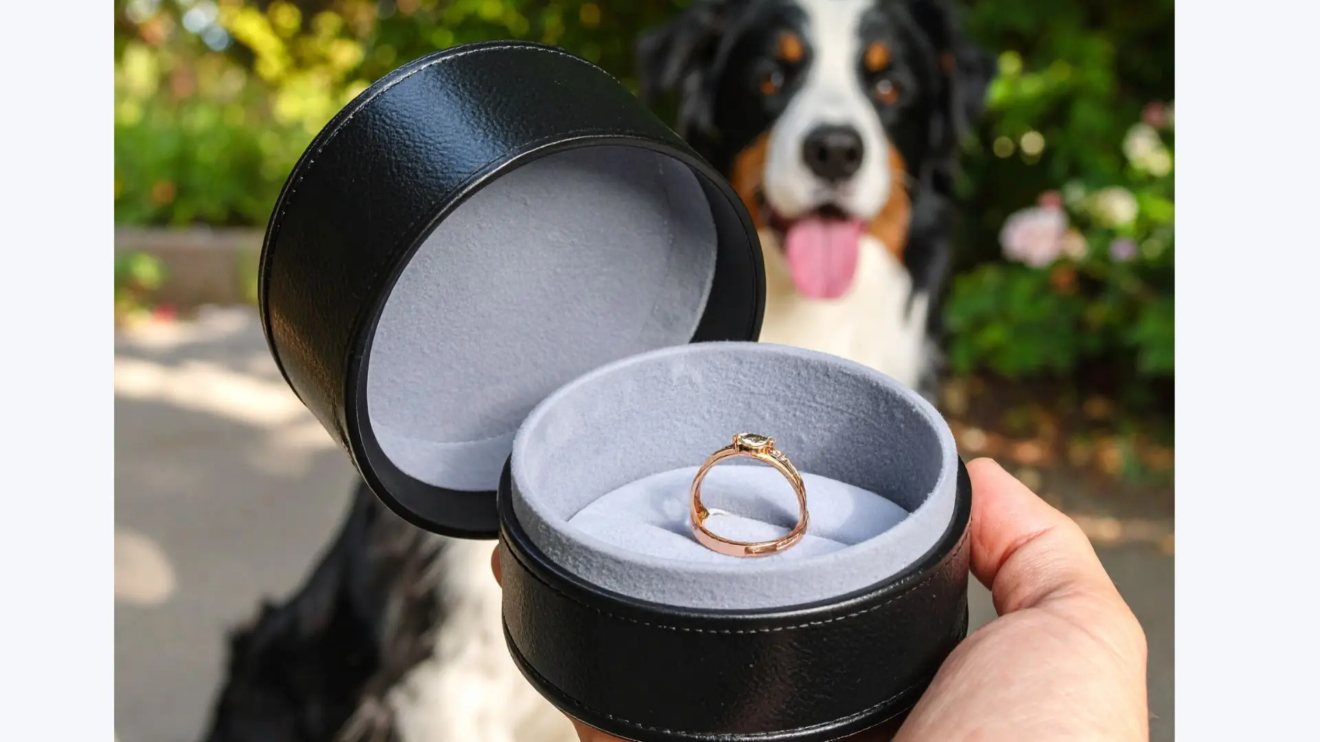 Der treueste Begleiter wird zum heimlichen Helfer: Ihr Hund bringt den Ring am Halsband - oder trägt das Etui im Mund - direkt zum Partner und sorgt damit für einen Moment voller Überraschung, Gefühl und einem breiten Lächeln.